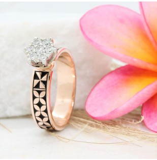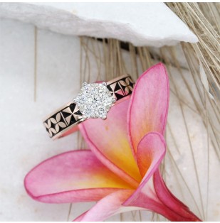 This engagement ring is part of our new 4 ring concept. This ring is available in all white gold, or yellow gold with the black detailing. It is set with a cluster of diamonds that give the illusion of 1 large diamond. Total diamond weight = 0.35ct. On the wedding day you can add the fine wedding bands to complete the set (NC045S). The matching mens wedding band is NC045M.